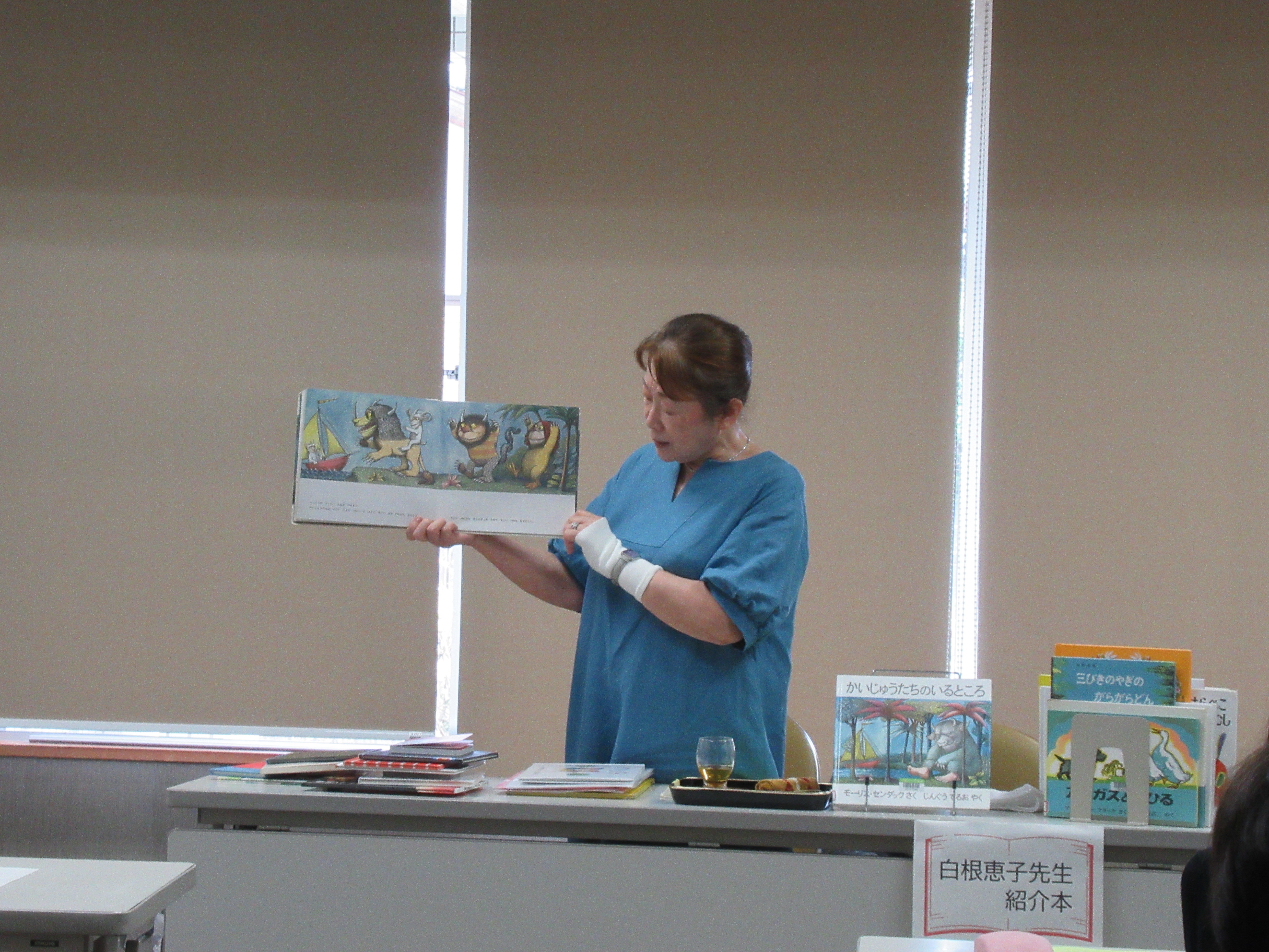子どもと絵本講座の1回目は、佐賀女子短期大学名誉教授の白根恵子先生をお招きし、絵本の読みきかせが子どもの成長にどのように作用するかをお話しいただきました。