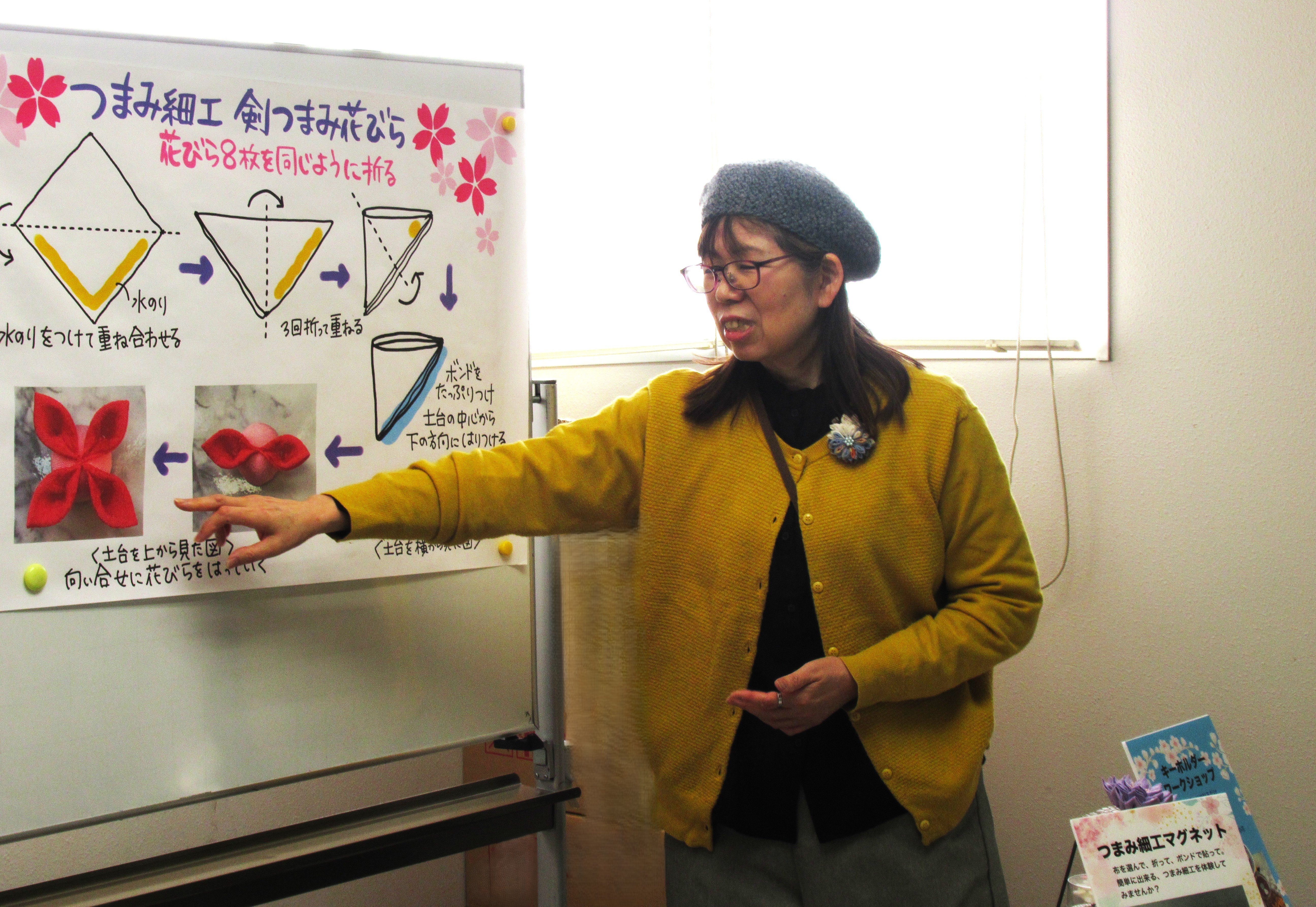報告:マルシェなどに出品されている「studio△1081」の竹内さんを講師にお迎えし、つまみ細工でマグネットを作りました。