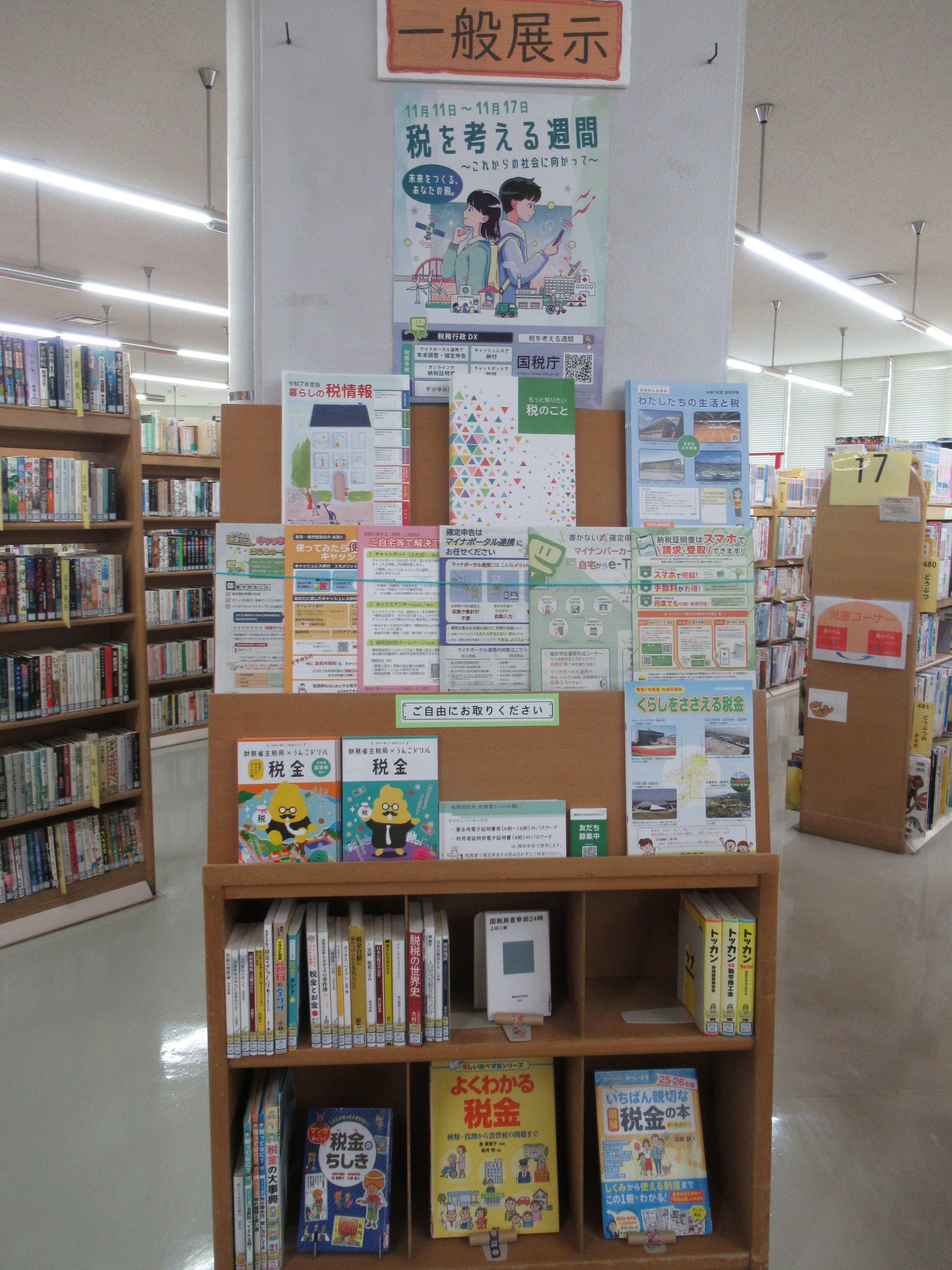 現在の一般展示 税を考える週間 11月11日から17日まで、国税庁が提案する「税を考える週間」となっています。 大人から子どもまでが納める消費税の他にも、所得税・酒税・相続税・固定資産税など、さまざまな税金がわたしたちの生活に関わっています。 なぜ税金が必要なのか、義務や得られる権利など、税金について考える展示を行います。