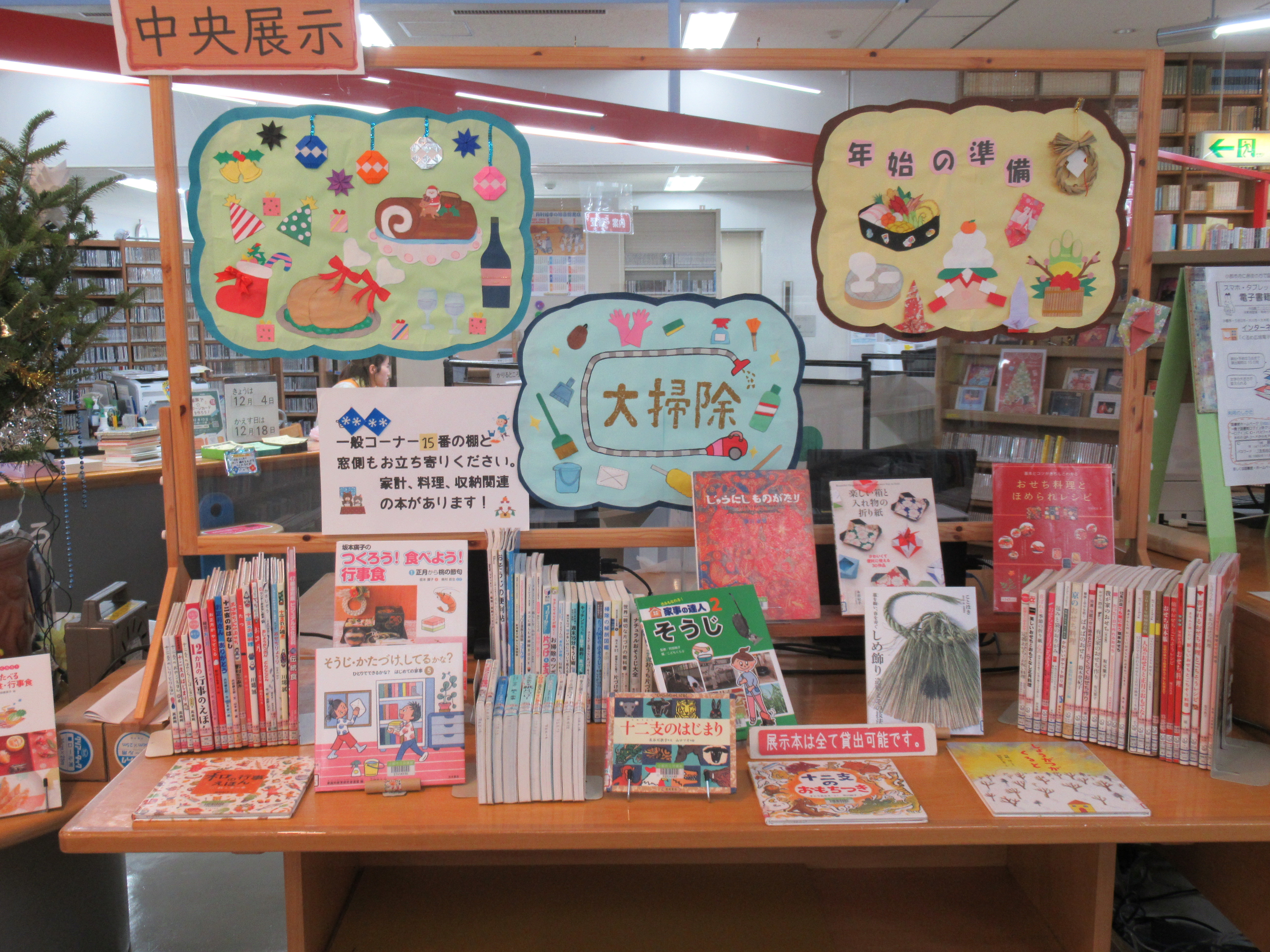 現在の中央展示 クリスマス・大掃除・年始の準備 毎年行っているクリスマス用の本をクリスマスツリーと一緒に展示しています。クリスマスの本は絵本と読物、そしてクリスマスの料理などたくさん準備していますので、みなさん楽しいクリスマスをお過ごしください。 また、よい年を迎えるための大掃除・年始の準備の本もご用意していますので、ぜひお手に取ってください。