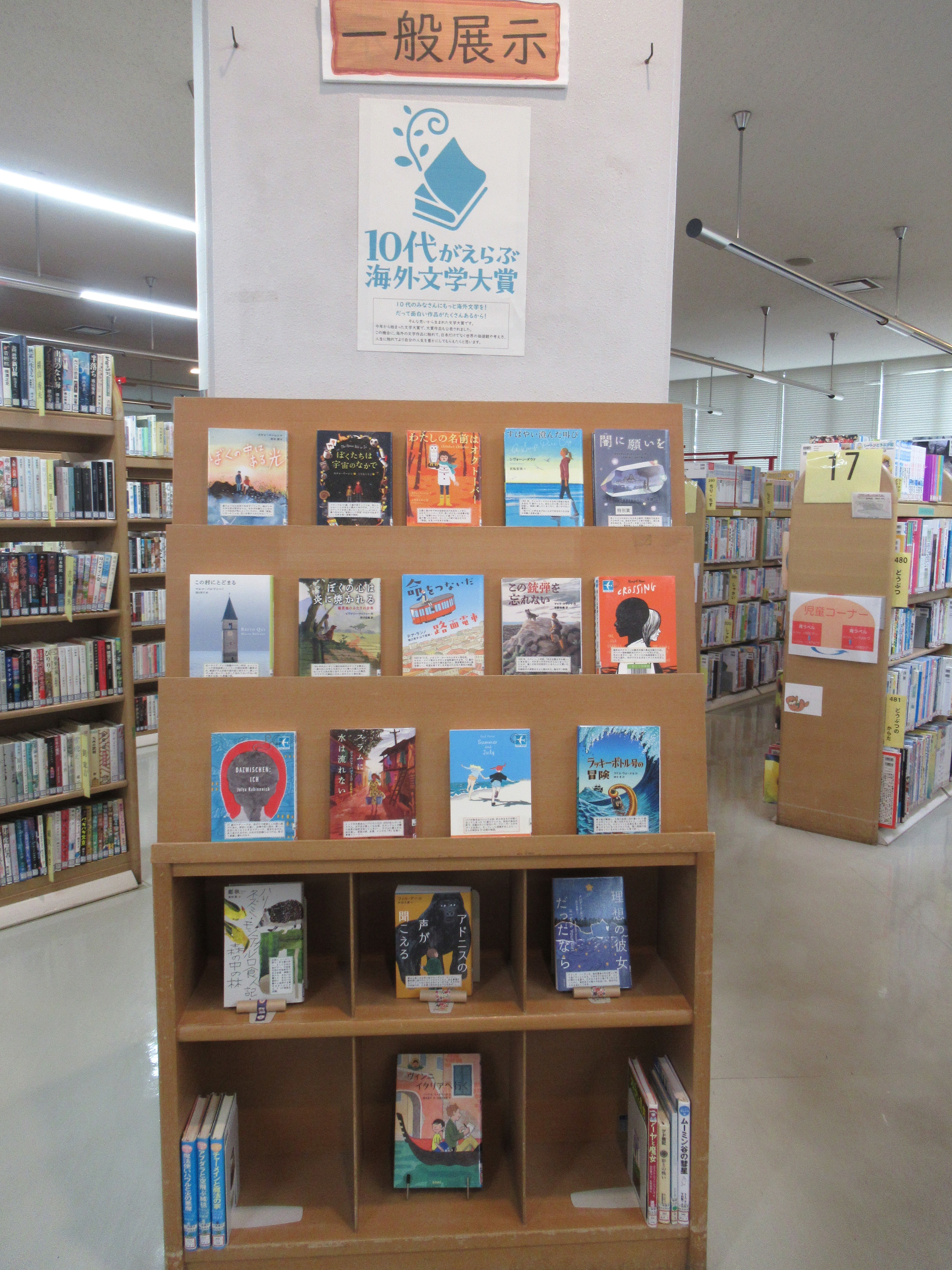 現在の一般展示 10代が選ぶ海外文学大賞 今年から始まった「10代が選ぶ海外文学大賞」の波に乗らねばならぬと展示を開始しました。これから、どんどん自分の世界を広げていく10代の皆さんに、日本以外の世界の人たちの考え方や文化に触れてもらうための身近な手段の一つが、海外文学だろうと思います。そして、10代の皆さんだけでなく、全ての方にも、常に新しい世界が広がっています。 当館を利用するすべての人に、新鮮で新しい世界との出会いが、日々提供できますように…。