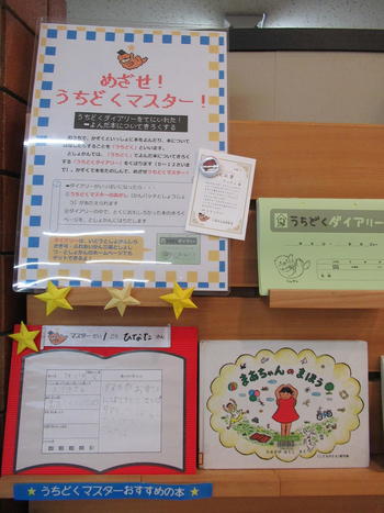 "うちどくマスター"の認定証(賞状)と記念の缶バッジを贈呈します。その際、ダイアリーの中から特におすすめの1冊を選んでいただきます。市立図書館職員がそのページをコピーし、後日うちどくコーナーにて「うちどくマスターおすすめの本」として掲示させていただきます。(その際はお子さんの下の名前のみ紹介させていただきます)